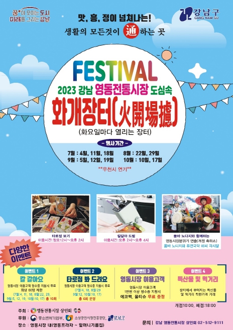 전통시장 마케팅을 지원하기 위한 시장경영패키지 사업의 일환으로 이뤄지는 이번 행사는 영동전통시장 상인회가 주관하고 중소벤처기업부, 소상공인시장진흥공단, 강남구가 후원한다.