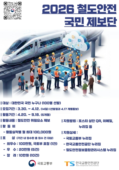 [뉴스힘=박노신 기자] 국토교통부는 철도 이용과정에서 발생할 수 있는 위험요인을 국민의 시선에서 발굴‧개선하고, 전국 철도안전 수준을 제고하기 위해한국교통안전공단(이사장 정용식)과 함께 3월 30일부터 ‘2026 철도안전 국민제보단’을 모집한다.