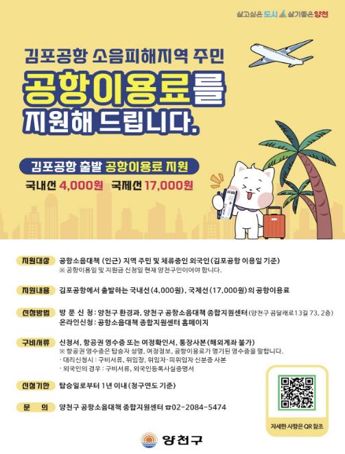 2024년 수도권 최초로 도입한 김포공항 이용료 지원 사업은 공항 인근에 거주하며 만성적인 항공소음 불편을 감내해 온 주민들을 위해 양천구가 적극적으로 제도를 개선하고 자체 예산을 투입해 마련한 지원 정책이다.