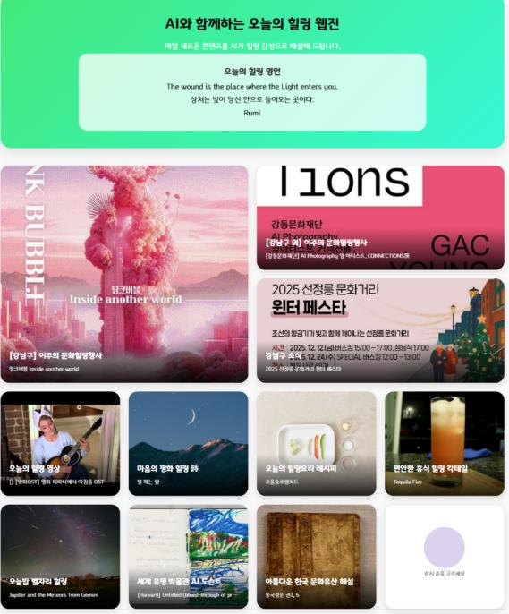 웹진이 제공하는 8가지 핵심 콘텐츠는 인문, 예술, 미식, 정보 등 다방면에서 정서적 안정을 돕는다. 먼저 AI가 엄선한 긍정 메시지인 ‘힐링 명언’과 전 세계 명시를 감성적으로 해설한 ‘힐링 詩’는 문학적 사색을 제공한다. 메트로폴리탄 등 세계적 박물관의 작품을 설명하는 ‘AI 도슨트’와 검증된 영상을 레트로 감성으로 재해석한 ‘힐링 영상’은 시각적 즐거움을 더한다.