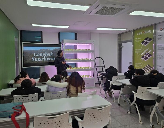 | ▲ ‘2025년 신나는 방학-가보고 싶은 교실’에서 아이들이 강북구 스마트팜 체험 활동을 하고 있다. |