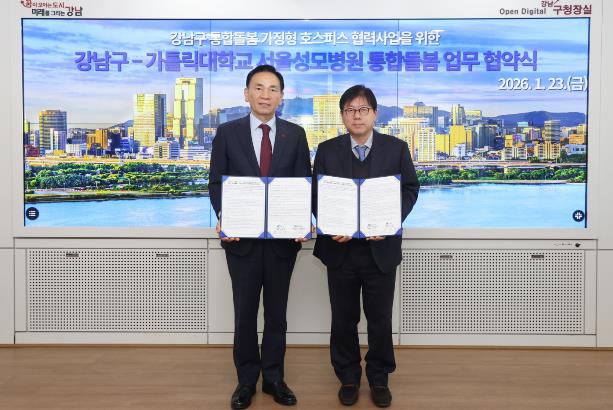 [뉴스힘=박노신 기자] 꿈이 모이는 도시, 미래를 그리는 강남구가 지난 1월 23일 구청에서 가톨릭대학교 서울성모병원과 ‘강남구 통합돌봄 가정형 호스피스 협력사업’ 추진을 위한 업무협약(MOU)을 체결했다. 이 협약은 자치구와 상급종합병원이 연계해 가정형 호스피스를 지원하는 체계를 공식화했다는 점에서 그 의미가 크다.