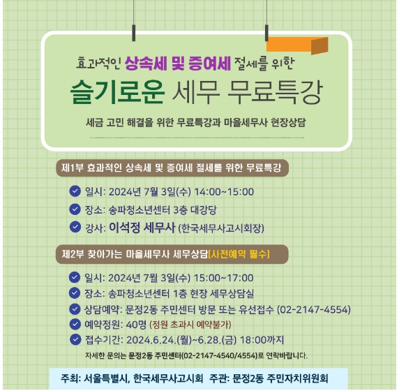 [뉴스힘=주신락 기자] 송파구가 오는 7월 3일 14시 송파청소년센터에서 상속‧증여세에 대한 무료 특강을 연다.