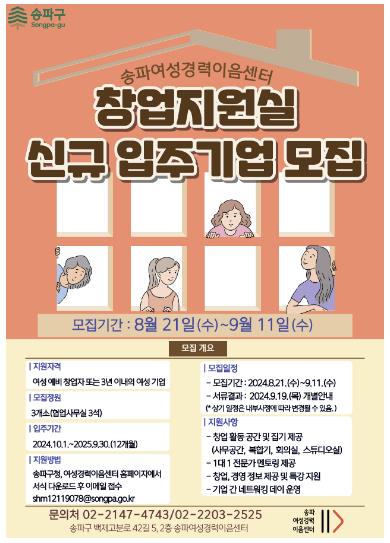우대조건은 송파구 소재 기업 또는 주소를 송파구에 둔 구민이며, 계약기간 1년 만료 후 내부 연장심사를 거쳐 최대 2년까지 입주가 가능하다. 구 누리집 또는 송파여성경력이음센터 누리집에서 신청서를 작성해 이메일로 접수하면 된다.