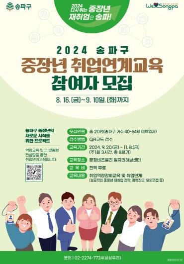 서강석 송파구청장은 “중장년층의 취업역량을 강화하고 채용연계를 통한 양질의 일자리를 창출하기 위한 전문프로그램을 마련했다”며 “이번 교육과정이 사회진출과 재취업에 어려움을 겪는 중장년 송파구민들에게 실질적인 도움이 되기를 바란다”고 전했다.