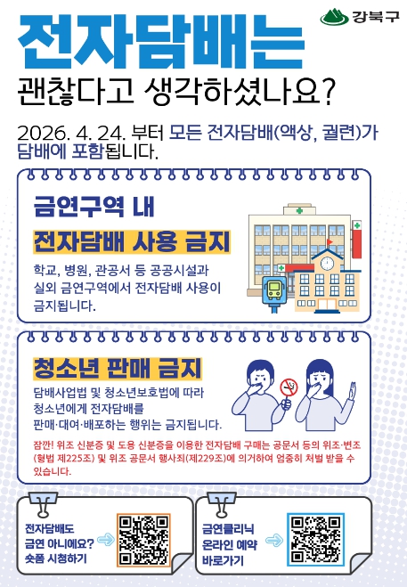 [뉴스힘=박노신 기자] 서울 강북구는 오는 24일부터 시행되는 담배사업법 개정에 따라 금연구역 내 전자담배 사용이 전면 금지된다고 밝혔다.