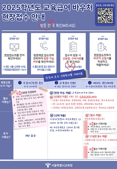[뉴스힘=박노신 기자] 서울특별시교육청은 오는 12월 2일부터 12월 12일까지, 2025학년도 교육급여 바우처 미신청자 중 온라인 신청이 어려운 대상을 위해 한시적 현장 접수를 운영한다고 밝혔다.