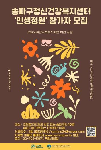 [뉴스힘=주신락 기자] 송파구가 위탁 운영하는 송파구정신건강복지센터가 오는 8월 9일까지 ‘인생정원’ 사업 참가자 20명을 모집한다.