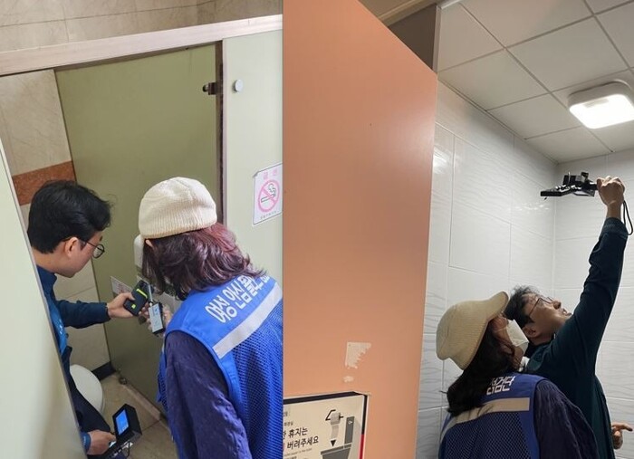 | ▲ 주민감시단이 개방화장실의 불법 촬영 장비 설치 유무를 점검하고 있다. |