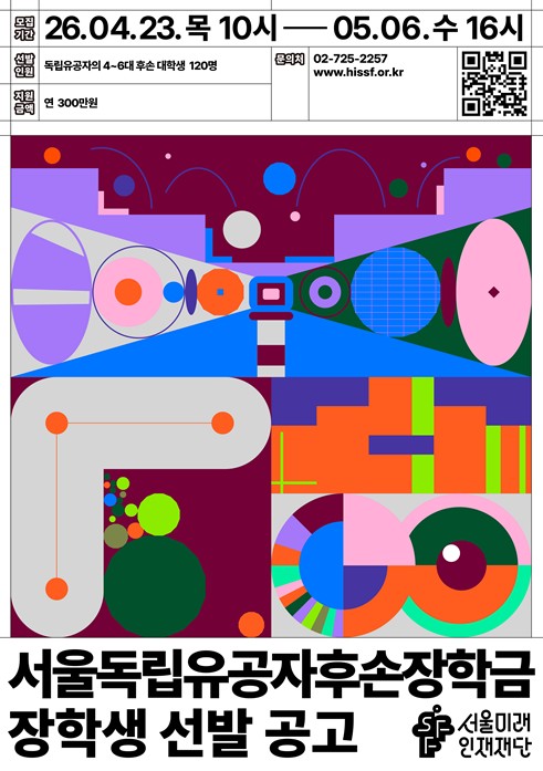 [뉴스힘=박노신 기자] 서울미래인재재단은 독립유공자(순국선열‧애국지사)의 증손자녀 이하 4~6대 후손 120명을 선발해 1인당 연 300만 원(150만 원 2회 분할 지급)씩 총 3억 6천만 원 규모의 장학금을 지원하는 ‘서울독립유공자후손장학사업’을 추진한다.
