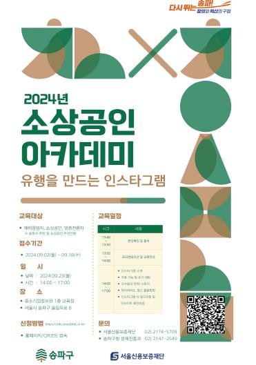 교육은 오는 9월 23일 월요일 오후 2시부터 5시까지 송파구 상공회 중소기업 정보관에서 진행된다.