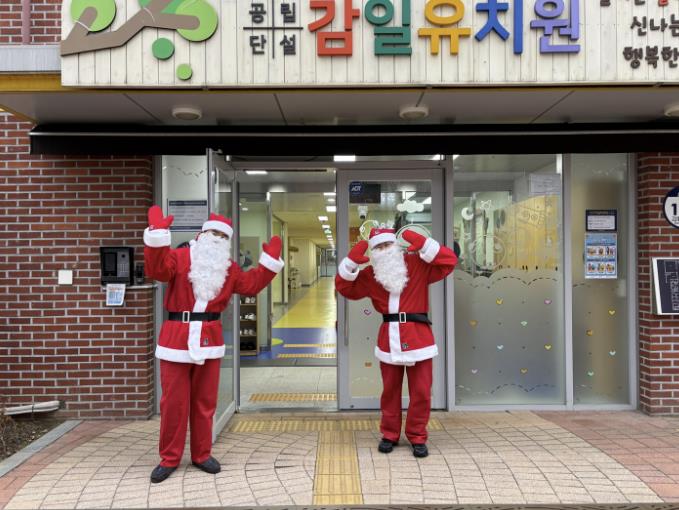 감일유치원 학부모회는 성탄절을 맞아 산타 복장을 하고 등원하는 유아들을 맞이하며 선물을 전달하는 행사를 마련했다. 아침 등원길에 깜짝 등장한 산타를 본 유아들은 환한 표정으로 반가움을 표현하며 성탄절의 설렘을 만끽했다.
