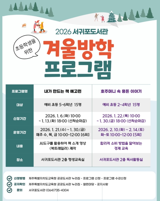 [뉴스힘=박노신 기자] 제주도교육청 서귀포도서관은 겨울방학을 맞아 어린이들의 호기심을 자극해 책 읽기의 즐거움과 경제 감각을 키우는 겨울방학 프로그램을 운영하며, 내년 1월 6일부터 참가자를 모집한다.