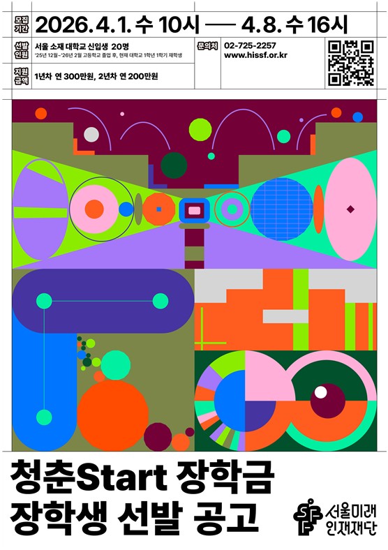 [뉴스힘=박노신 기자] 서울미래인재재단이 ㈜두산 임직원 기부금으로 14년째 운영 중인 '청춘Start장학금' 14기 장학생 20명을 모집한다. 서울 소재 대학에 올해 입학한 저소득 신입생을 대상으로 2년간 총 500만 원의 학업장려금을 지급하며, 신청은 4월 8일 16시까지 재단 누리집에서 받는다.
