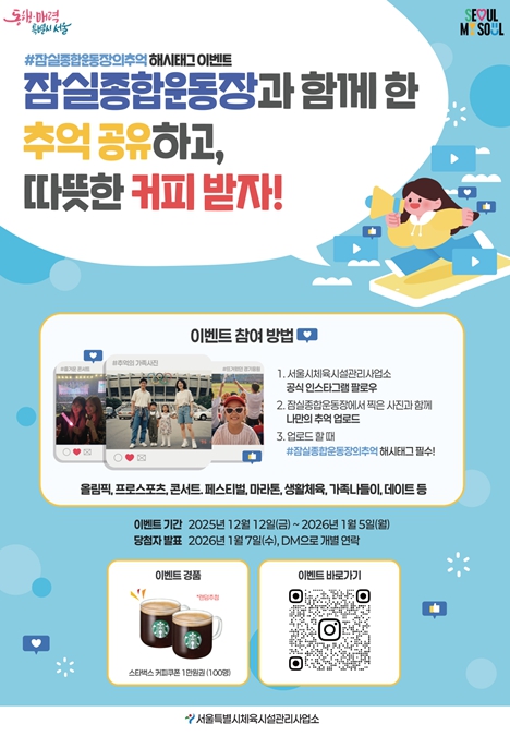 [뉴스힘=박노신 기자] 서울시 체육시설관리사업소는 잠실종합운동장에서 시민이 경험한 다양한 추억과 기억을 수집하기 위한 SNS 이벤트 '#잠실종합운동장의 추억 해시태그 이벤트'를 2026년 1월 5일까지 진행한다고 밝혔다.