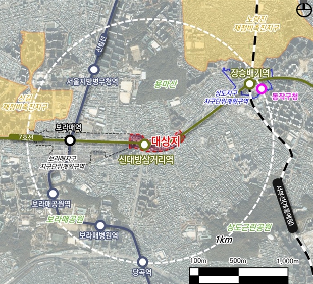 대상지는 지하철 신대방삼거리역(7호선) 일대로, 서측으로는 보라매역(7호선·신림선), 동측으로는 장승배기역(7호선·서부선(예정))이 위치하고 있어 광역교통의 중간적 요충지로서 위상과 기능이 강화되고 있는 지역이다.