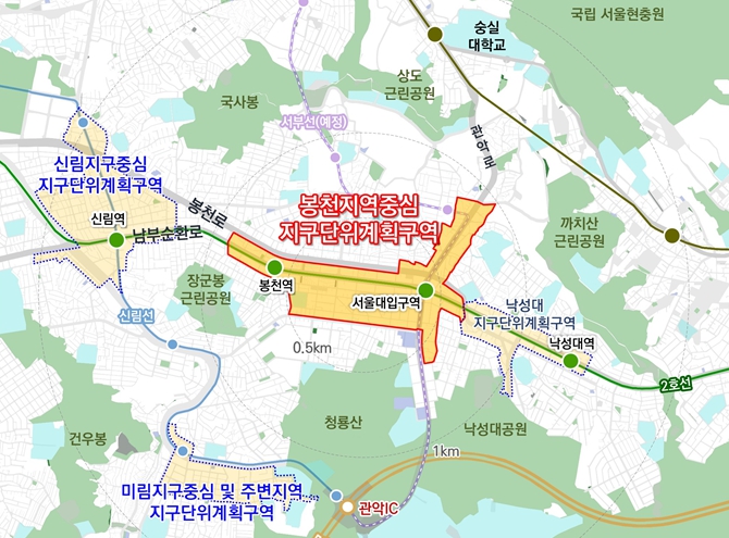 이번 지구단위계획 재정비는 2016년 이후 변화된 지역 여건을 고려하고, 저층 노후건축물이 지역중심 역세권 위상에 맞게 개발될 수 있는 기반을 마련하고자 추진됐다. 남부순환로 일대는 일자리 창출 복합거점으로 조성, 서울대입구역 일대는 업무·상업 복합거점으로 육성, 관악로변 일대는 서부선(예정) 계획에 맞추어 전략적 업무 거점으로 재탄생될 전망이다.