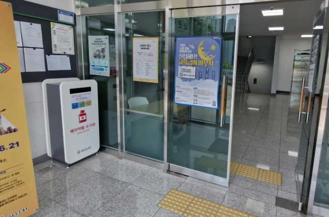 | ▲ 덕풍1동 행정복지센터 입구에 설치된 폐의약품 수거함 모습 |