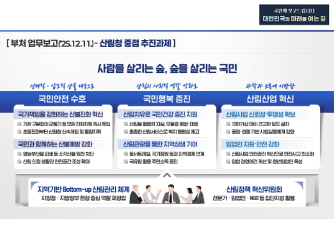 [뉴스힘=박노신 기자] 산림청은 ‘정부 업무보고’를 계기로 ‘사람을 살리는 숲, 숲을 살리는 국민’ 실현을 위한 중점 추진과제를 11일 발표했다.