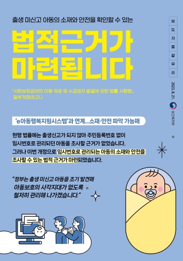 보건복지부는 8월 21일 국무회의에서 '사회보장급여의 이용ㆍ제공 및 수급권자 발굴에 관한 법률 시행령' 일부개정령안이 의결됐다고 밝혔다. 이번 시행령 개정으로 주민등록번호 없이 예방접종 통합관리시스템상 임시번호로 관리되는 아동과 아동 보호자의 정보를 ‘e아동행복지원시스템’으로 연계하여, 출생미신고 아동의 양육환경을 확인할 수 있게 된다(별표 2 제3호).