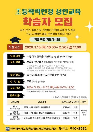 [뉴스힘=박노신 기자] 광주시교육청송정다가치문화도서관은 ‘2026학년도 초등학력인정 성인교육’ 프로그램을 운영한다.