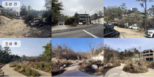 | ▲ 공원 조성 전 훼손, 방치된 모습과 조성 후 계절마다 색다른 정취를 즐길 수 있는 ‘사계 정원’ 전경 |