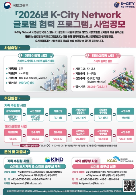 김연희 국토교통부 도시경제과장은 “K-City Network 글로벌 협력사업은 해외 도시와 함께 스마트도시를 기획하고 현장에서 실증까지 이어지는 대표적인 글로벌 협력 플랫폼”이라며, “2026년에는 AI 융합 스마트 솔루션의 해외 적용을 확대해 우리기업의 지속가능한 해외수출과 글로벌 경쟁력 강화를 적극 지원하겠다”고 밝혔다.