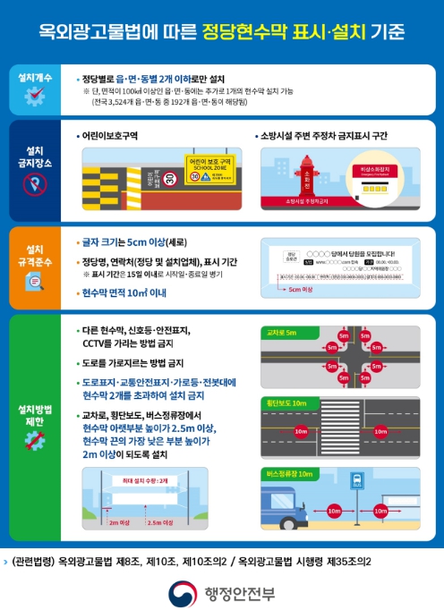 현행 옥외광고물법에 따르면 정당 현수막은 신고 없이 읍·면·동별 2개까지 15일 동안 자유롭게 설치할 수 있으나, 어린이보호구역과 소방시설 주변은 설치를 엄격히 금지한다. 특히, 보행자와 운전자의 시야를 방해할 수 있는 교차로와 횡단보도 주변에는 현수막 아랫부분의 높이를 2.5m 이상으로 설치해야 한다.