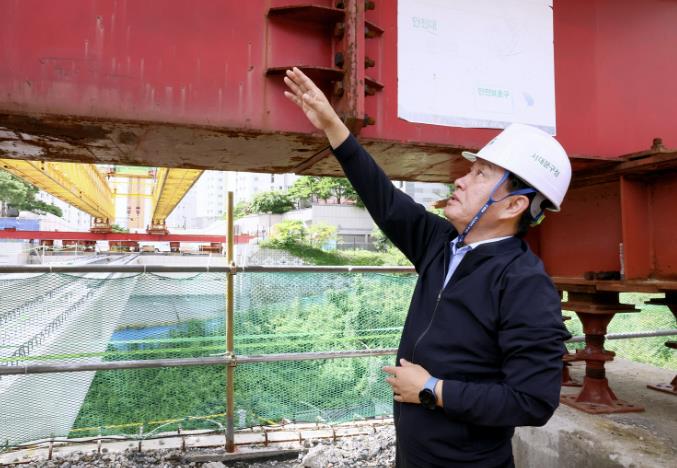 | ▲ 지난해 7월 ‘북아현 과선교’ 공사 현장을 찾아 진행 상황을 살피고 있는 이성헌 서대문구청장. |