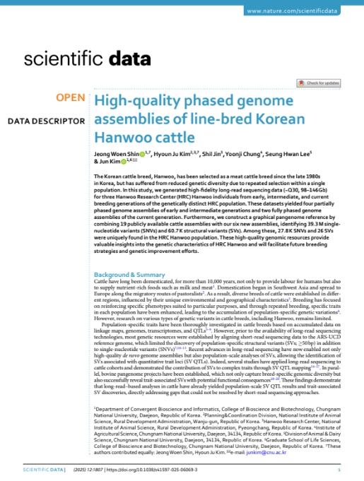 아울러 고품질 유전체 지도를 인공지능 기반 정밀 육종, 유전 다양성 평가 및 관리, 근친 교배 예방, 질병 예측 및 예방 연구 등에 활용해 농가 생산성 향상과 한우산업 경쟁력 확보에 이바지할 것으로 기대했다. 이번 성과는 국제 학술지(Scientific Data)에 게재됐다.