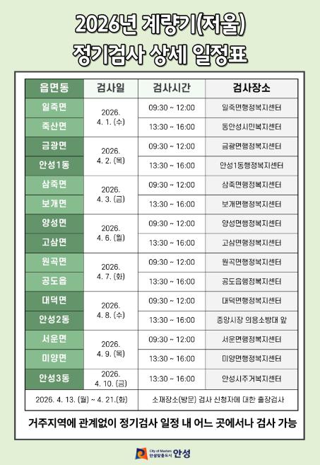 정기검사는 4월 1일부터 10일까지 읍·면·동 순회검사 방식으로 진행되며 검사 장소는 각 행정복지센터를 비롯해 안성시 주거복지센터와 안성중앙시장 등이다.