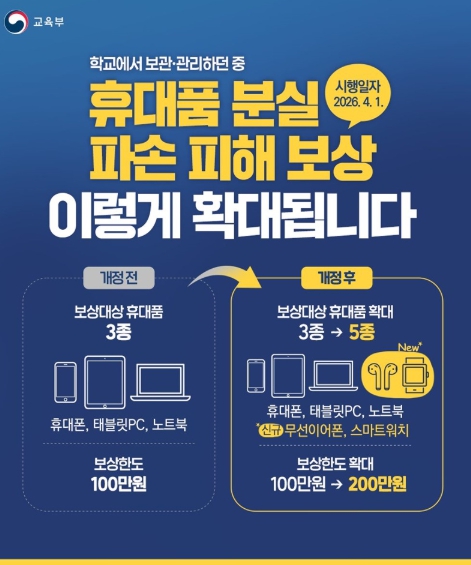 [뉴스힘=박노신 기자] 학교에서 보관·관리하던 중 휴대품 분실·파손 피해 보상 이렇게 확대됩니다.