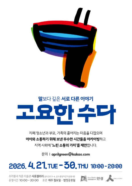 [뉴스힘=박노신 기자] 안성시 시옷갤러리는 오는 4월 21일부터 4월 30일까지 자폐 청소년과 그 가족이 함께 참여하는 전시 《고요한 수다》를 개최한다고 밝혔다.