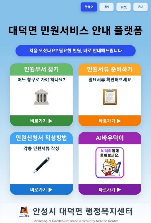 | ▲ 안성시 대덕면, '디지털 민원안내 플랫폼' 5월 4일 본격 가동… 고령층·외국인 민원 접근성 개선 |