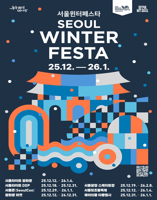 서울시는 오는 12월 12일부터 2026년 1월 4일까지 24일간, 광화문광장~청계천~서울광장~DDP~보신각~우이천 6곳을 잇는 초대형 겨울축제 '2025 서울윈터페스타'를 개최한다고 밝혔다. 올해 행사는 궁중문화축전 및 전국무용제 등 대한민국 대표축제를 성공적으로 이끈 이재원 총감독이 지휘한다.