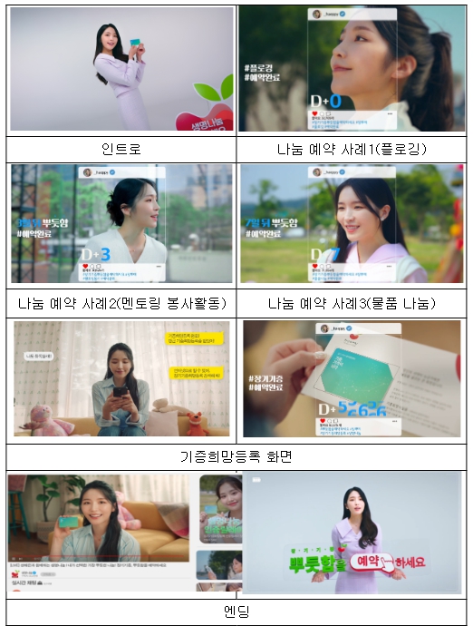 이번 광고는 나눔과 관련된 다양한 ‘예약’의 긍정적인 모습을 통해 장기기증희망등록에 동참하는 것도 일상에서 쉽게 참여할 수 있는 하나의 ‘예약’이며, 이를 통해 일상의 큰 뿌듯함을 얻을 수 있다는 것을 표현했다.