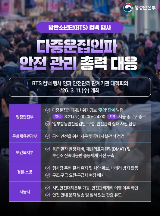 - BTS 컴백 행사 인파 안전관리 관계기관 대책회의 '26.3.11.(수) 개최