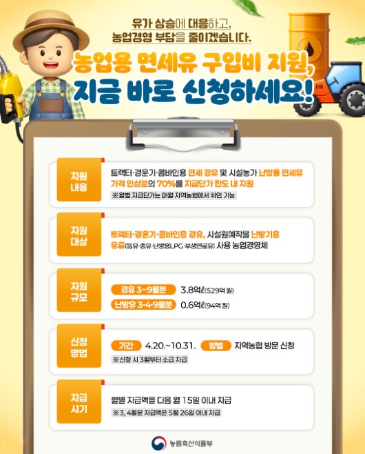 농식품부는 이번 추경예산에 중동 전쟁으로 인한 농가의 유류비 부담을 줄이기 위해 올해 3월부터 9월까지 트랙터, 경운기, 콤바인 가동에 사용하는 경유와, 3월, 4월, 9월에 원예시설 난방 용도로 사용하는 등유·중유·부생연료유·LPG에 대해 기준가격 대비 인상액의 70%를 유종별 한도금액 범위 내에서 지원하는 유가연동보조금 지원 예산을 편성했다.