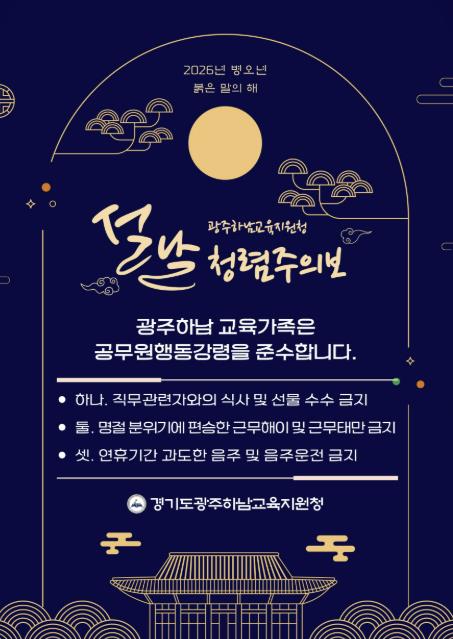 [뉴스힘=박노신 기자] 경기도광주하남교육지원청은 오는 2월 9일, 2026년 병오년 설명절을 맞아 관내 교직원들이 청렴한 마음가짐으로 새해를 시작할 수 있도록‘교육장 청렴서한문’과‘청렴주의보’를 각급 학교에 전달했다.