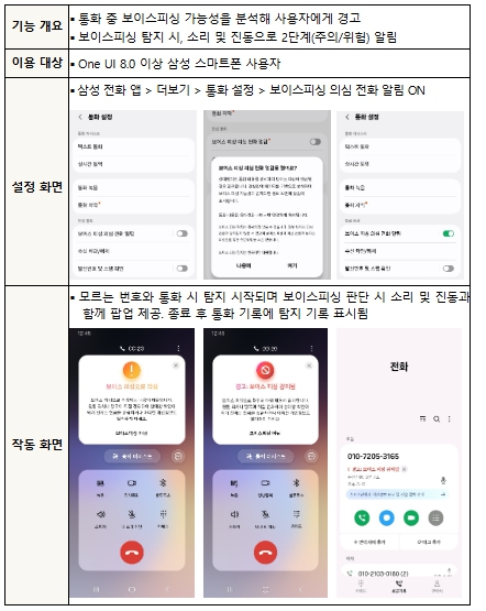 삼성전자는 갤럭시 스마트폰에 기본으로 탑재된 전화 앱에서 ‘보이스피싱 의심 전화 알림’ 기능을 제공하고 있다. 이 기능은 모르는 번호로 걸려온 전화의 통화 내용을 분석해 ‘의심(보이스피싱 의심)’, ‘경고(보이스피싱 감지)’ 등 2단계에 걸쳐 이용자에게 알림을 제공한다.