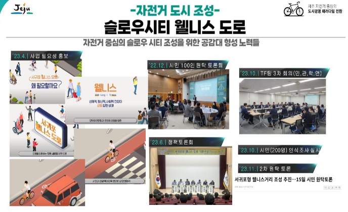 [뉴스힘=박노신 기자] 제주특별자치도는 도로 다이어트를 통해 자동차 도로를 줄여 자전거 전용도로를 설치하는 등 도로 환경을 새롭게 조성했다. 또한, “자전거 정책 전담팀”을 조직하여 정책 지속성과 전문성 확보에 힘썼다. 이를 통해 제주도는 자동차 중심의 도시에서 자전거와 보행자 중심의 도시로 변화하고 있다.