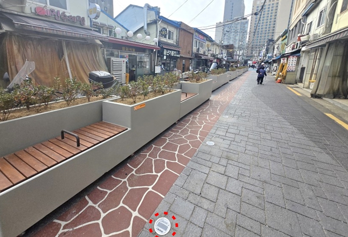 | ▲ 안심보행길 시공 후(솔라표지병, 플랜터(화단)) |