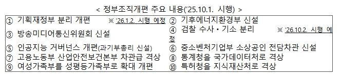 먼저, 정부조직개편은 특정 부처에 집중된 기능과 권한을 재배치하고, 기후 변화, AI 대전환 등 미래 위기에 선제적으로 대응하기 위해 기획재정부 분리 개편, 기후에너지환경부 신설 등을 중심으로 추진했다.