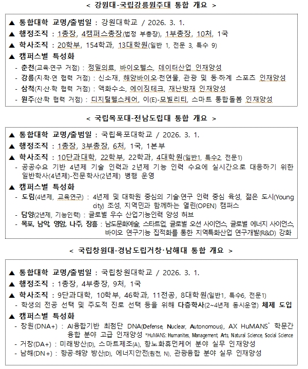 최교진 교육부 장관은 “대학 통합은 대학의 경쟁력을 확보하고, 지역 소멸 위기에 대응하는 효과적인 전략이라고 생각한다.”라고 말하며, “새롭게 출범하는 통합대학들이 국가 균형 발전의 선도적 역할을 할 수 있도록 관심과 지원을 아끼지 않겠다.”라고 밝혔다.