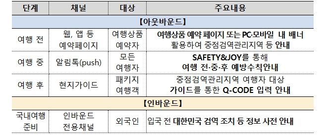 업무협약 내용으로는 ▲여행자 대상 감염병·건강정보 제공 확대, ▲연휴·국제행사 등을 계기로 캠페인 기획·추진, ▲콘텐츠 공동 기획·제작, ▲해외여행 전 주기(예약-출국-현지-입국)에 걸친 협력 방안 발굴 등이다.