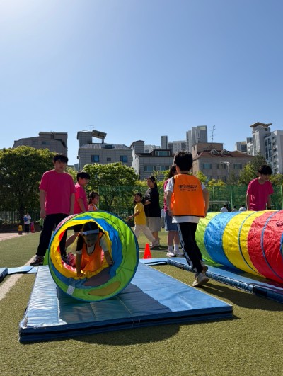 행사에서는 준비운동을 시작으로 다양한 체험 중심 프로그램이 진행됐다. ‘터널 통과 놀이’, ‘뜀뛰기 놀이’ 등에서는 6학년 학생들이 어린 동생들의 손을 잡고 활동을 이끌었으며, ‘탱탱볼 놀이’, ‘바운스볼’에서는 서로 호흡을 맞추며 협동심을 키웠다. 또한 ‘비눗방울 놀이’, ‘컵쌓기’, ‘고리 던지기’, ‘복돼지 축구’, ‘게이트볼’ 등 다양한 종목을 통해 함께 목표를 달성하는 즐거움을 경험했다.