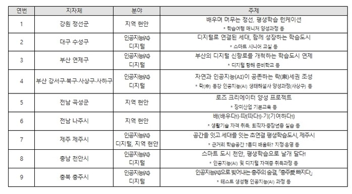 올해 교육부와 국가평생교육진흥원은 인공지능(AI) 대전환 시대 도래, 고령화·인구감소 등의 지역 현안 대응 등에 발맞춰, 기존 평생학습도시 201개(’25년 기준) 중 9개 평생학습도시를 지역의 색깔을 살린 ‘특성화 평생학습도시’로 거듭나도록 지원한다. 이번에 선정된 특성화 평생학습도시는 인공지능(AI)·디지털 학습, 지역 산업 참여, 세대 간 교류, 중장년 인재양성 등에 집중하여 평생교육을 지원할 계획이다.