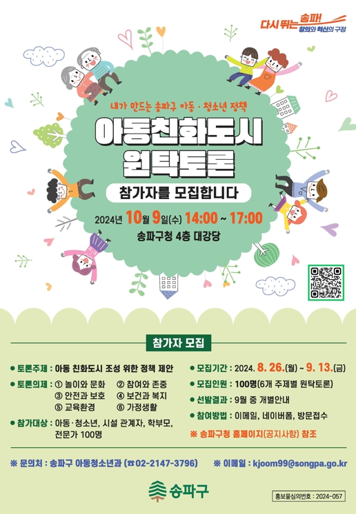 [뉴스힘=주신락 기자] 송파구가 아동정책 방향에 대한 생생한 목소리를 듣는‘아동친화도시 100인 원탁토론회’ 참가자를 오는 8월 26일부터 9월 13일까지 모집한다.