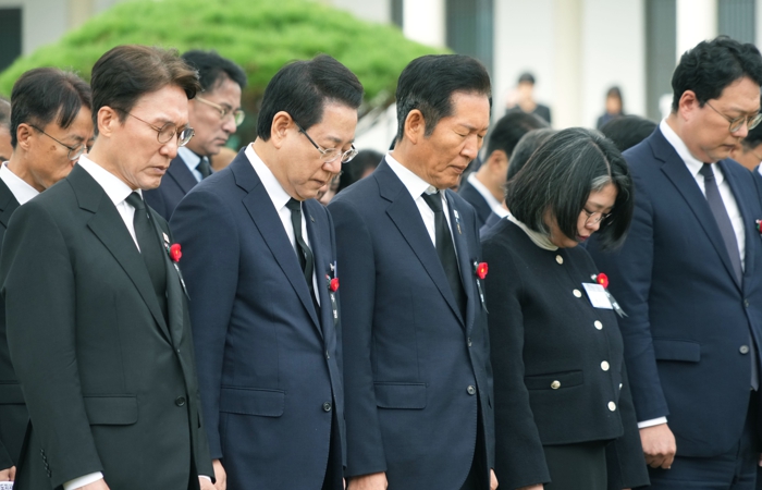 ▲ 김영록 전라남도지사가 19일 구례군 지리산역사문화관에서 열린 ‘여순사건 제77주기 합동추념식’ 행사에서 김민석 국무총리, 정청래 민주당 대표 등 국회의원들과 희생자들에 대한 묵념을 하고 있다. |