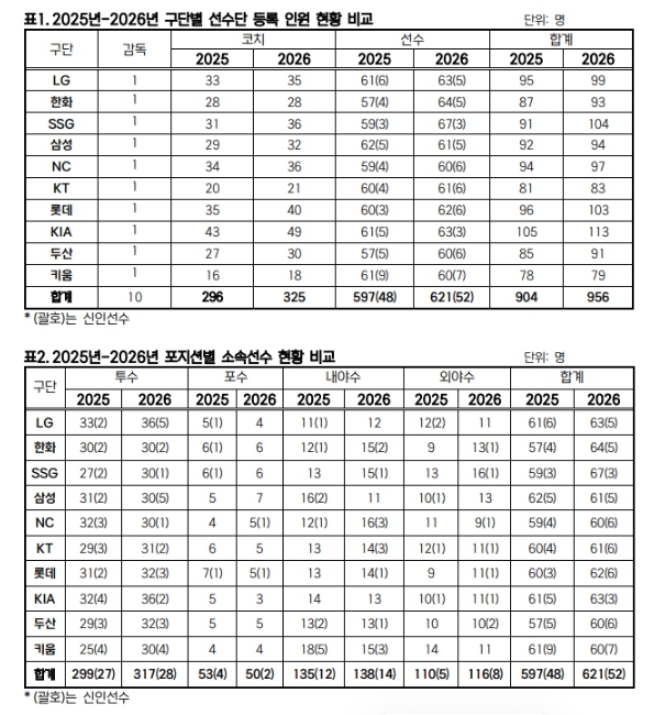 [뉴스힘=박노신 기자] KBO는 2월 10일(화) 2026년 KBO 리그 소속 선수 명단을 공시했다. 10개 구단은 총 621명의 선수를 등록해, 597명이 등록했던 2025년보다 24명이 늘어났다.